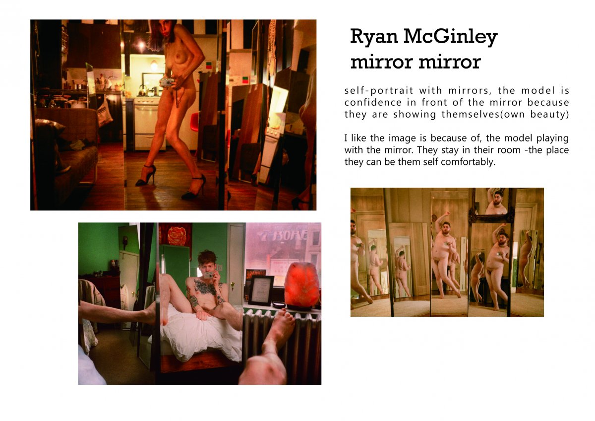 This is the self-portrait work. He took the picture of the self, he naked while without penis and with braid. the image is clear and simple that he wants to show he is being he self, and the last image is he with his mom,I think he want to show that his mom support he and still love him.
